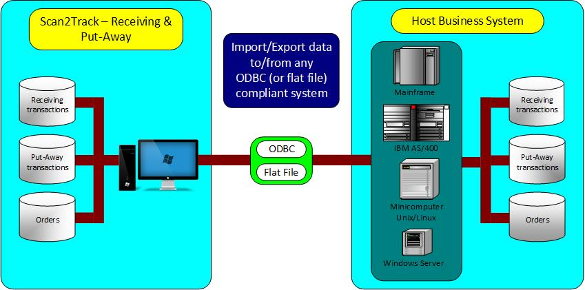 Scan2Track Receiving & Put-Away software was designed and built to easily integrate to external sources from the ground up. Communication with existing databases, legacy systems, and network environments can be accomplished with intuitive easy to use interface tools. Information exchange between your host business system and the receiving personnel provides real-time accurate information to your host. You can integrate to one or more host environments simultaneously, such as your host business system and an application that may reside on the local network. Virtually any host platform is supported.